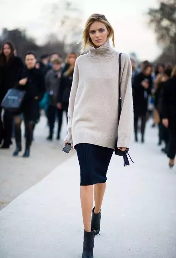 黑色高领毛衣是女性衣柜里必备的一件,无论搭配深色or浅色的衣服,都能给你的美增添光彩~搭配羽绒服,也精致干练,没有一丝累赘。