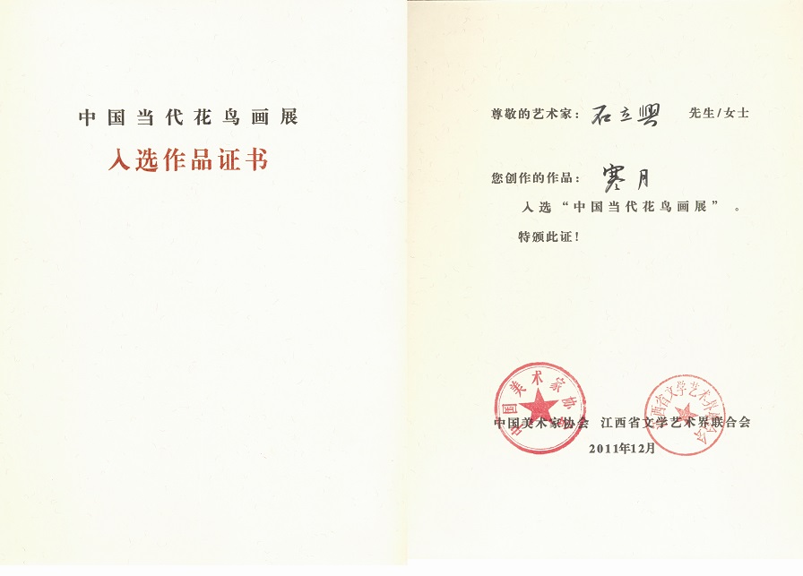2010年作品《寒月》入选“中国当代花鸟画展”。
