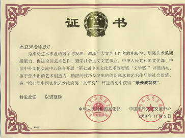 2010年中华人民共和国文化部、中国中外文化交流中心联合举办“第七届中国文化艺术政府奖'文化奖’ ”评选活动中获得“最佳成就奖”。