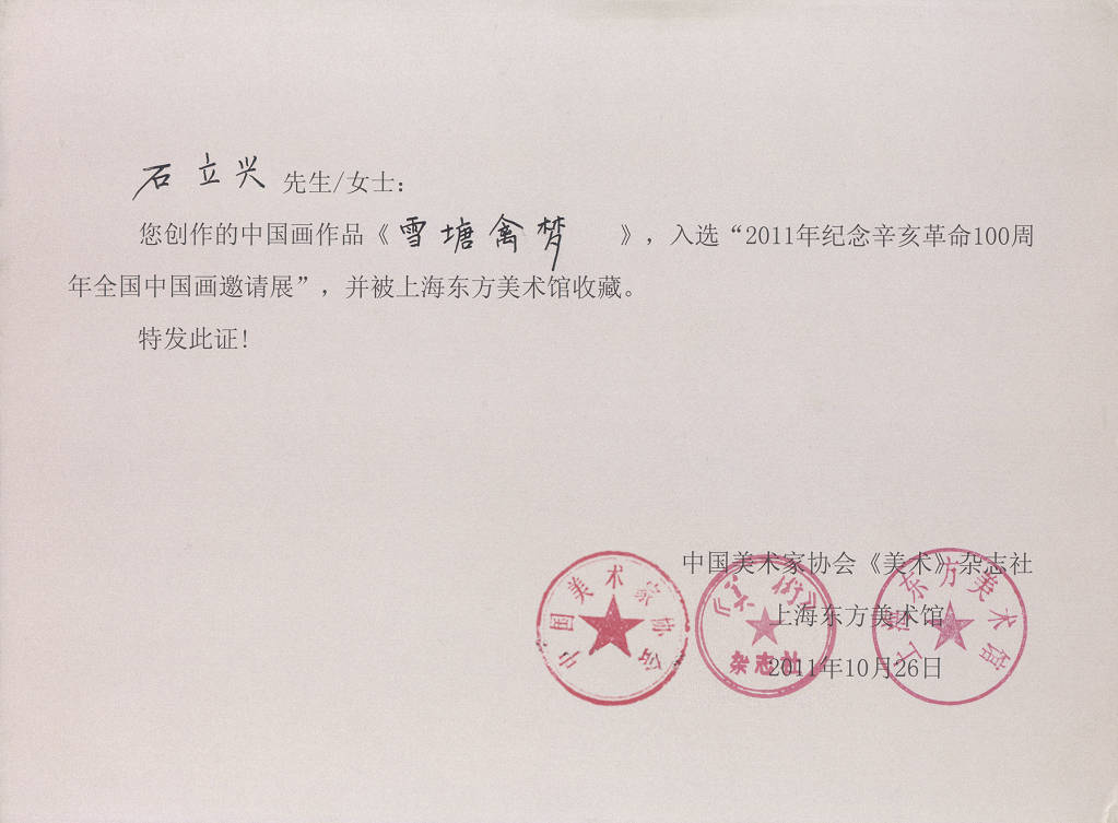 2011年作品《雪塘禽梦》被上海东方美术馆收藏。