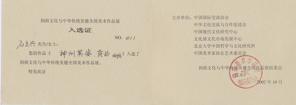 2003年国画作品《神州英姿》《霞曲》入选“妈祖文化与中华传统美德全国美术作品展”。