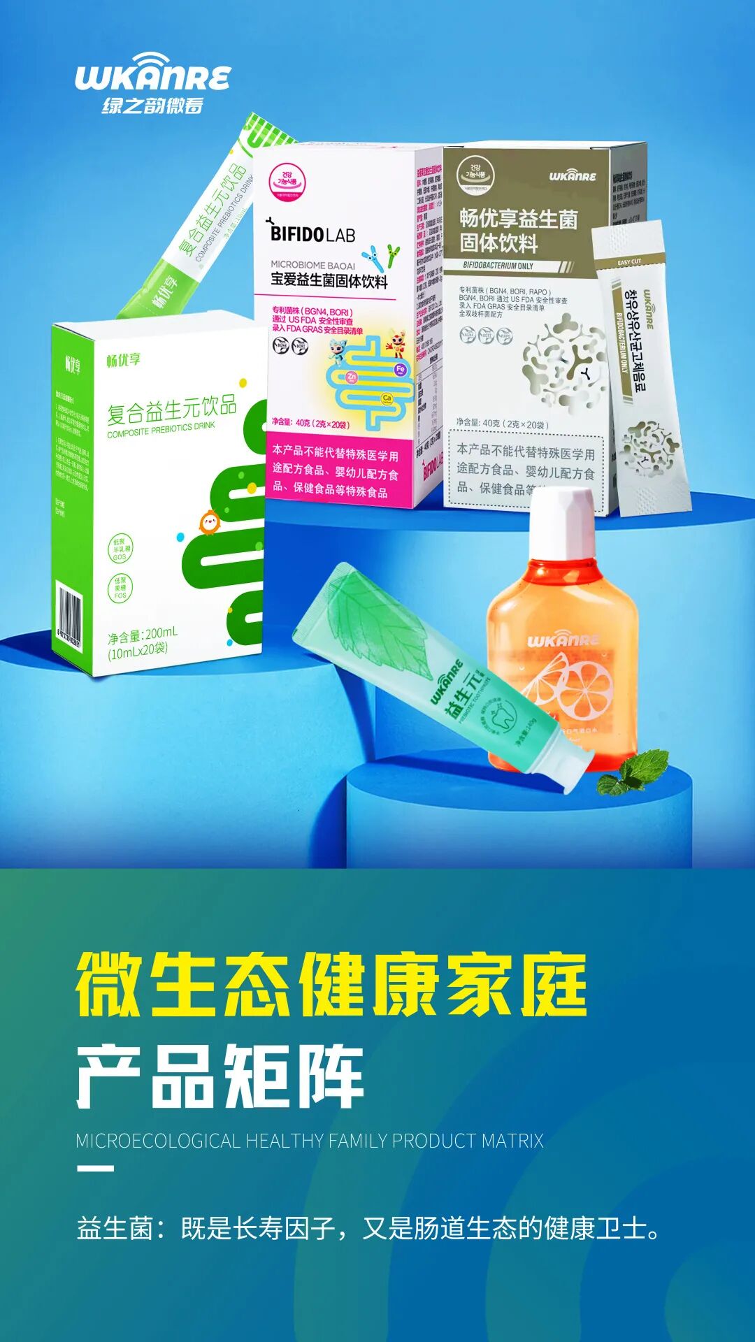 在产业选择上强调强逻辑的同时,范林也将具体产品的设计与推选赋予了强逻辑。微生态产品的主要呈现方式是益生菌、益生元、合生元,其中益生菌是对人体有益的微生物,益生元是一种膳食补充剂,而合生元是益生菌和益生元的复合制剂。因此,益生菌的菌株选择是产品背后是否具有强逻辑的关键。范林告诉我们,在益生菌市场刚刚在中国打开大门时,很多同类产品最初选择在菌株数量上进行宣传,有号称200亿的,甚至还有号称1200亿的……彼时大家觉得数量越多效果就一定越好。但经过行业多年的探索发现,抗氧化、抗胃酸、抗胆汁、定植能力等方面欠缺驯化的菌株在人体肠道很难存活,让产品效果大打折扣,因此益生菌产品一定要在有权威认证的明星菌种里进行挑选。为了确保菌种的质量,绿韵微看和韩国微生物领域最早上市公司BIFIDO进行了深入的合作,选取了3种适合亚洲人肠道的明星菌株,并以此为基础研发出了面向不同人群的益生菌产品。