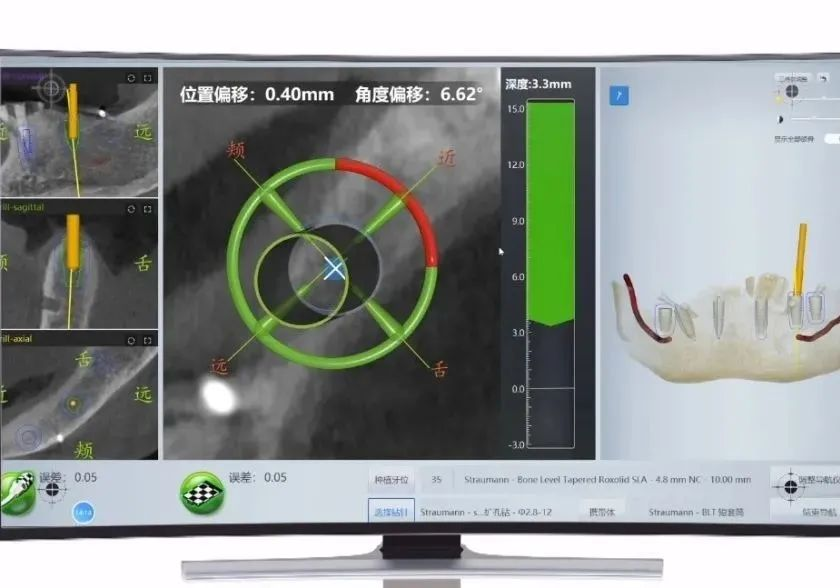 整个手术过程,北极星口腔专家团队运用微米级的可视化动态导航技术,成功地将种植部位与神经管分离开来,避免了牙槽神经受损的风险,减少了并发症的出现。术后检查显示种植体植入深度、角度等各项指数均达标,植体与神经管间距更是比临床惯例标准增宽1毫米。